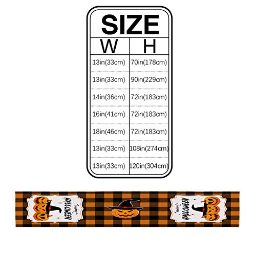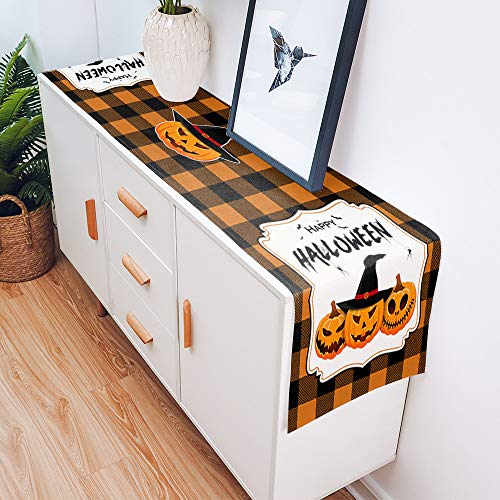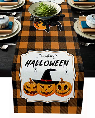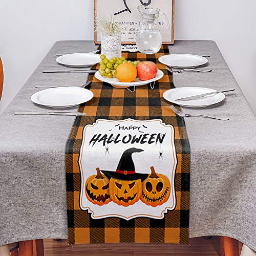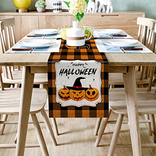 DoremiHome - مفرش طاولة من الخيش الكتاني لتزيين طاولة الطعام للاستخدام اليومي بتصميم بعبارة Happy Halloween، اغطية مائدة مقاس 18×72 بوصة لحفلات العشاء والمناسبات، نمط يقطين وخفاش وشبكة بلون برتقالي واسود
