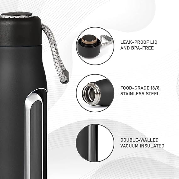- هذه الزجاجة المعزولة بالفراغ مزدوجة الجدران المصنوعة من الستانلس ستيل عيار 18/8 هي الغرض المناسب لك وهي جاذبة للأنظار. تحافظ الزجاجة المصنوعة من الستانلس ستيل على مشروباتك باردة لمدة تصل إلى 30 ساعة وساخنة لمدة تصل إلى 11 ساعة. قطعة الفم مصنوعة من الستانلس ستيل المصقول مع خيط داخلي لضمان تجربة شرب مثالية. بفضل تقنية القفل السريع، فإن الزجاجة مضادة للتسرب بمجرد قفلها بمقدار ربع دورة فقط. تحتوي جميع الزجاجات على حزام حمل مريح يمكن إزالته للتنظيف. متوفر بألوان ومقاسات متنوعة