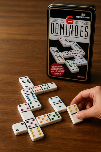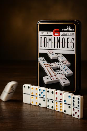 - محتويات المجموعة: مجموعة دومينو مكونة من 28 قطعة مع نقاط ملونة مزدوجة، تأتي في علبة معدنية سوداء أنيقة للتخزين