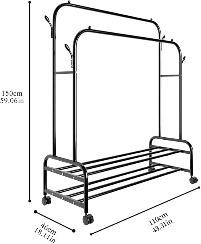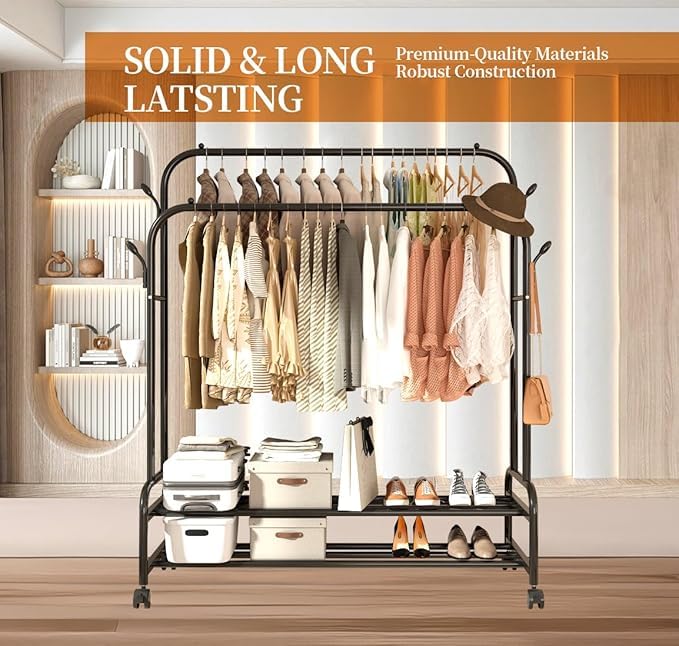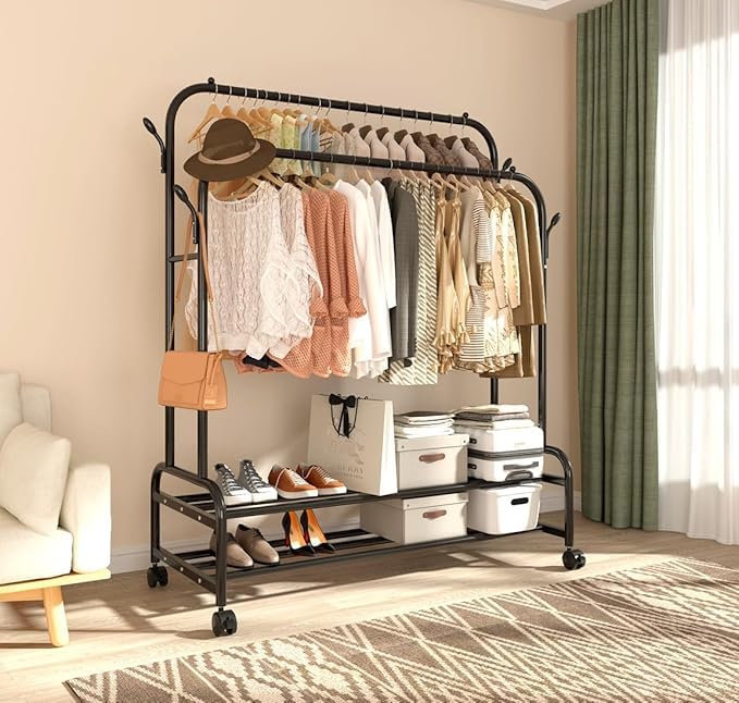 Generic - رف ملابس مزدوج من المعدن القوي مقاوم للصدأ مع عجلات، مزود بأرفف وعلاقات، رفوف ملابس متينة لتحمل الأوزان الثقيلة لتعليق الملابس، رف خزانة متعدد الوظائف لغرفة النوم