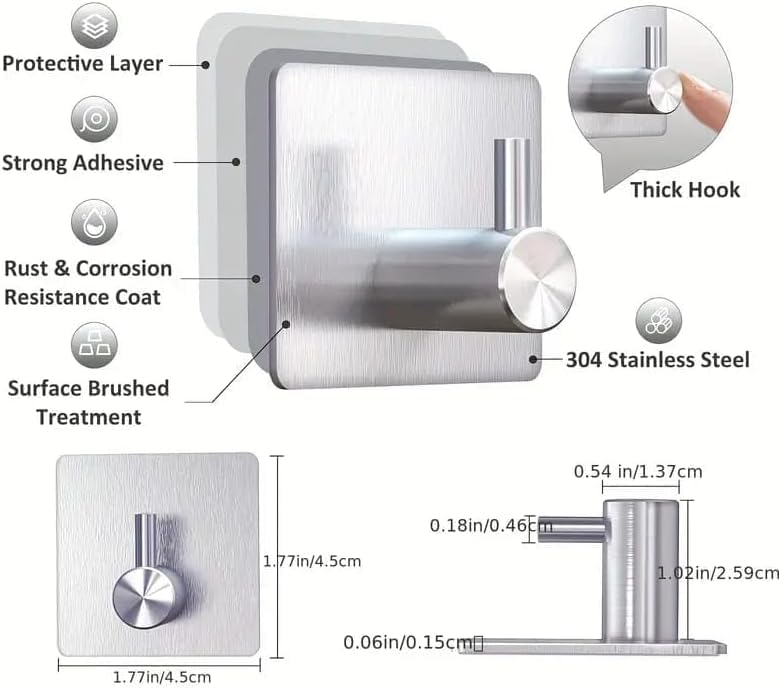 - مصنوع من استانليس ستيل عالي الجودة ومقاوم للصدأ: تم تصنيعه من مادة ستانليس ستيل (304) المتينة والمعروفة بمقاومتها العالية للصدأ والتآكل، مما يجعله مثالياً للاستخدام في البيئات الرطبة مثل الحمامات والمطابخ. يتميز الهوك بخامة ثقيلة ومصنع بدقة لضمان متانته واستمراره لفترات طويلة مع الحفاظ على مظهره اللامع والعصري.