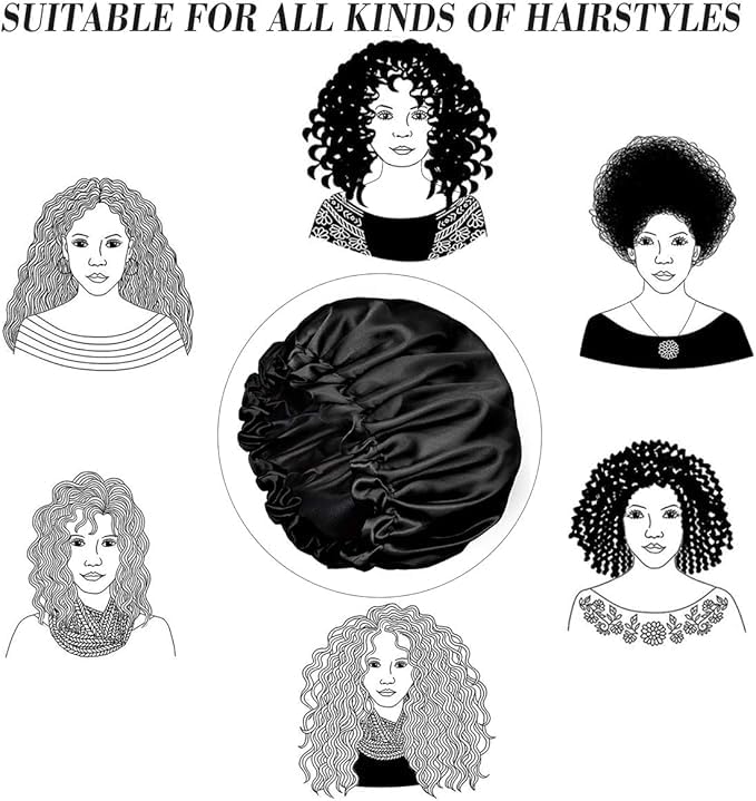 - قبعة ساتان كبيرة: يبلغ قطر قبعة النوم المصنوعة من الساتان حوالي 36 سم/ 14.2 انش، وتناسب جميع الرؤوس والشعر تقريبًا، مثل الشعر الطبيعي، والشعر الطويل، والشعر المجعد، والضفائر، والشعر المستقيم، وتسريحة ذيل الحصان وما إلى ذلك.
