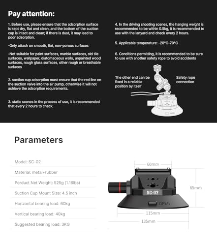 - كوب شفط بمضخة هواء مصنفة صناعيًا: يمكنه حمل معدات تصل إلى 3 كجم. شفط عمودي 40 كغم وشفط أفقي 60 كجم.