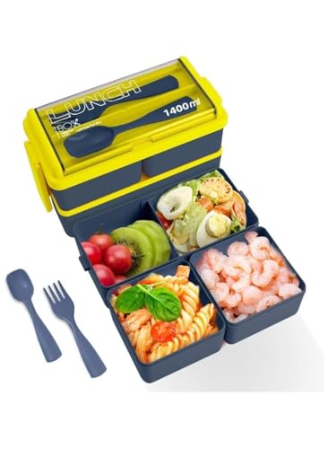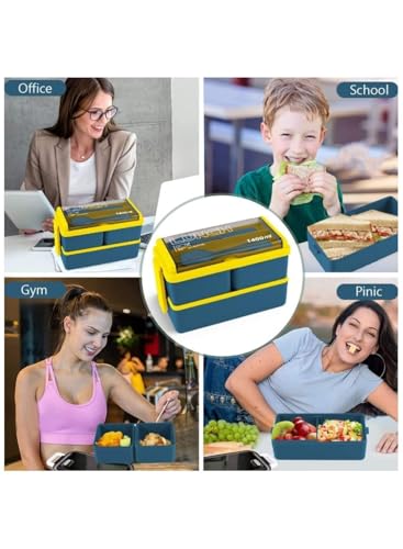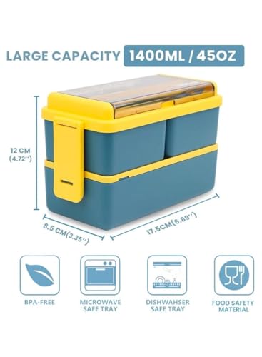 generic - صندوق بينتو مزدوج قابل للتكديس للاطفال، صندوق غداء مكون من 3 اقسام مع مواد امنة على الطعام، حاوية غداء مانعة للتسرب سعة 1400 مل