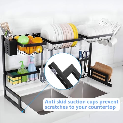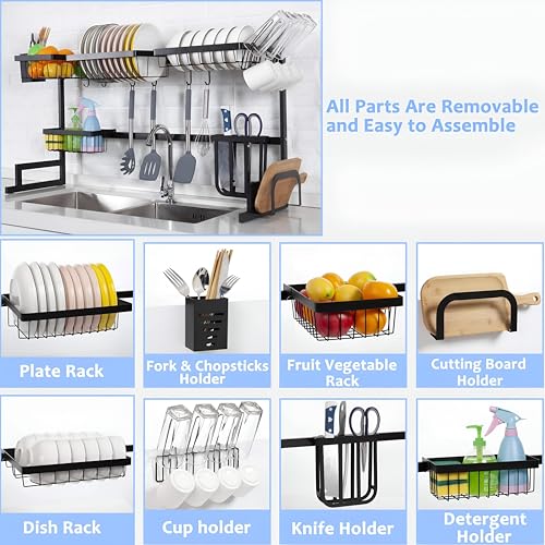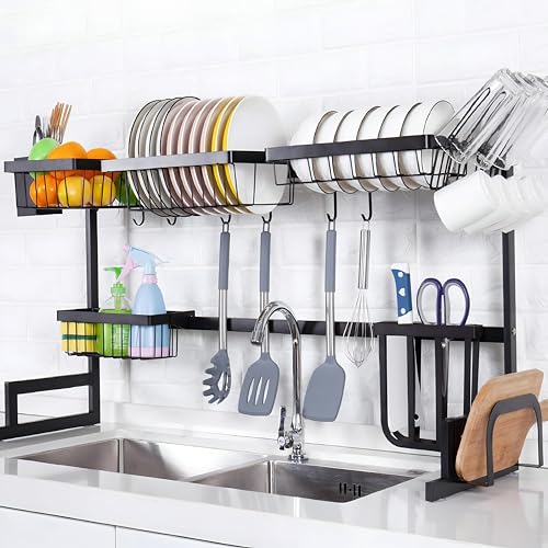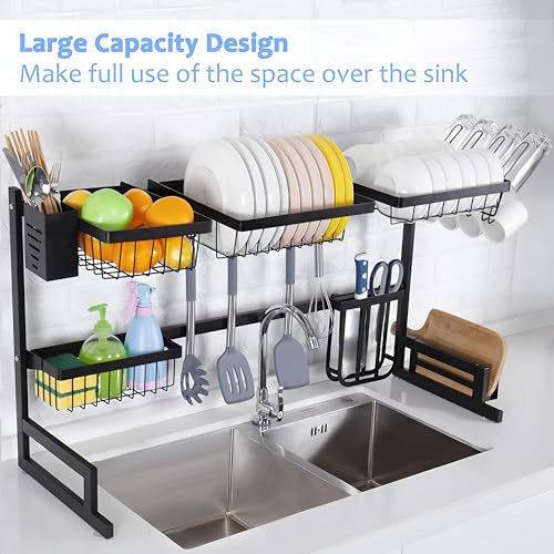 - يتميز رف الأطباق متعدد الوظائف هذا بتصميم من طبقتين من الستانلس ستيل يتناسب بشكل آمن فوق معظم أحواض المطبخ، مما يزيد من المساحة الرأسية مع الحفاظ على أسطح الطاولات جافة وخالية من الفوضى من خلال السماح بتصريف المياه مباشرة في الحوض.
