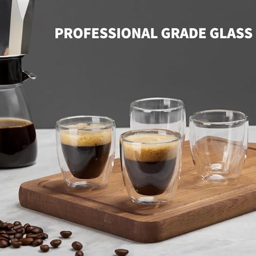 ROJZR - مجموعة اكواب اسبريسو مزدوجة الجدران من 4 قطع (اكثر سمكا بنسبة 50%)، اكواب شفافة سعة 3 اونصة، اكواب معزولة للمشروبات الساخنة والباردة، امنة للاستخدام في الميكروويف، مثالية للاستخدام في ماكينة تحضير