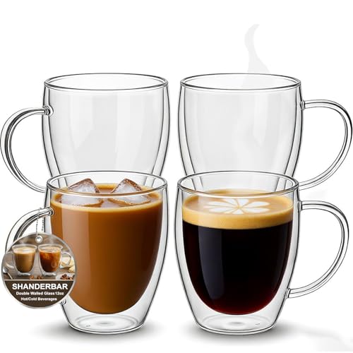 SHANDERBAR - Double Walled Glass Coffee Mugs with Handles, 12 OZ Clear Glass Coffee Cup Set of 4, Large Double Insulated Borosilicate Glass Mugs Bulk for Hot/Cold Beverages, Cappuccino, Espresso, Latte, Tea, Milk