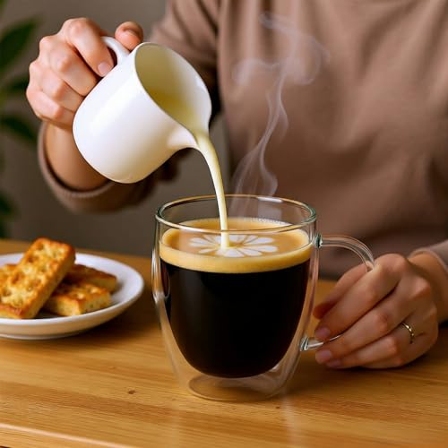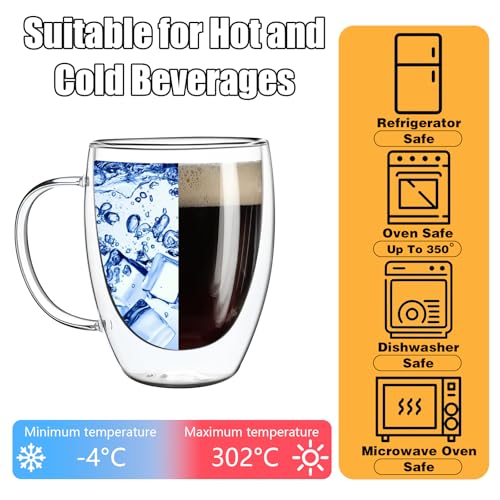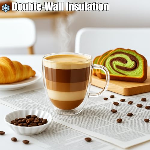 - Large Capacity: You will get 4 double wall glass coffee mugs with handles. Each glass espresso cup has a capacity of 350ml/12oz,suitable for most home,office and cafes. In addition,the clear glass coffee cups are designed with smooth rolled edges to give your lips a better taste of coffee. The handle is also professionally ergonomically designed,allowing you to easily hold the cup in your hand