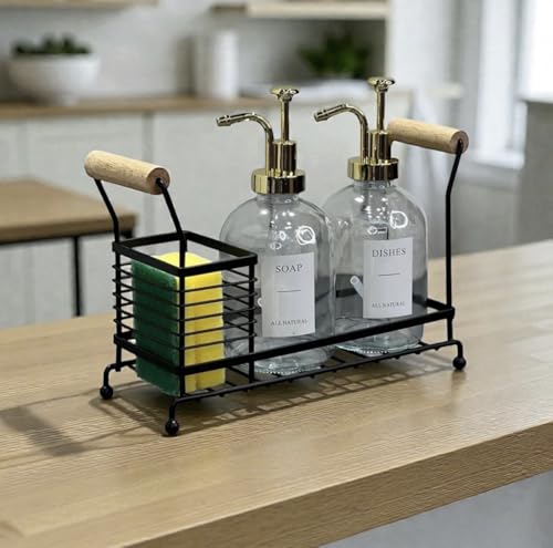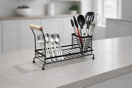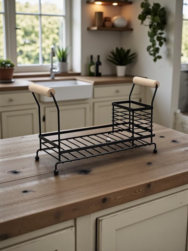 DOWNTOWN - داون تاون منظم حوض المطبخ مع سلة حامل للاواني - رف تخزين معدني لسطح الطاولة بمقابض خشبية واسفنجة وموزع صابون ومنظم ادوات المائدة للمطبخ والحمام - اسود