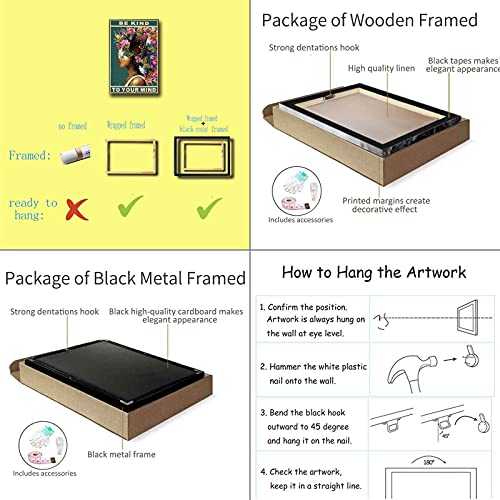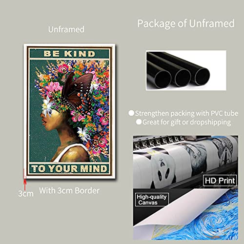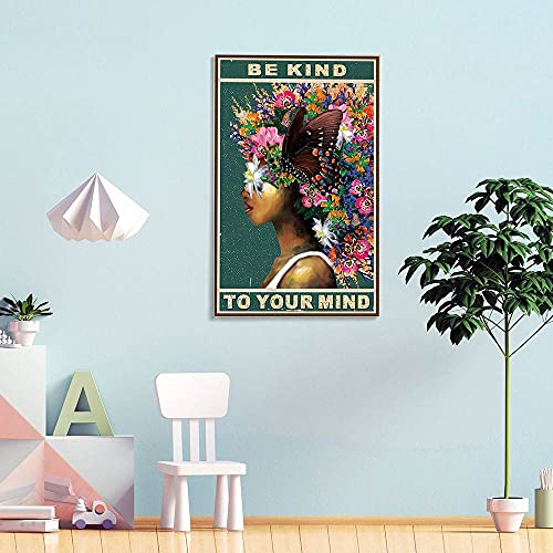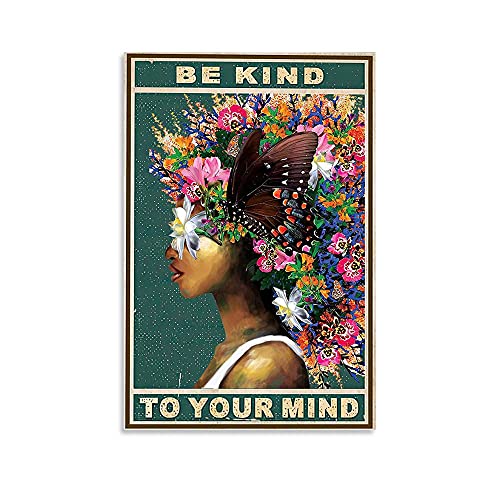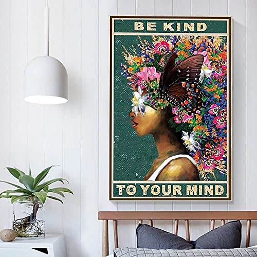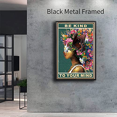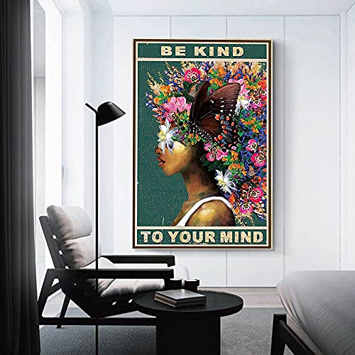 DPHGQGK - دي بي اتش جي كيو كيه ملصق حائط بطبعة عبارة «Be Kind To Your Mind» على شكل فراشة وزهرة ديكور امرأة افريقية قماش سوداء ملهمة منزل المزرعة وغرفة المعيشة - 12 × 18 انش 30 45 سم