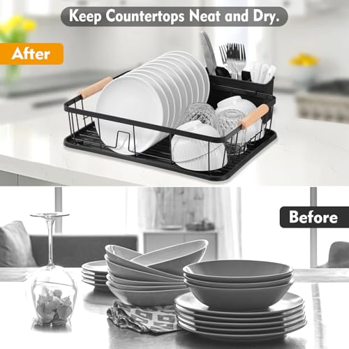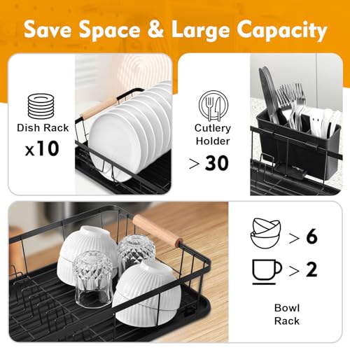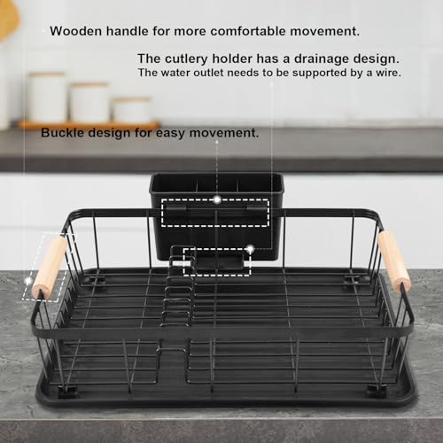 DPWEION - رف تجفيف اطباق للمطبخ من دبويون - رف تجفيف اطباق معدني مع صينية تنقيط/حامل ادوات المائدة/مقابض خشبية - رفوف لوح تصريف (43 × 31 × 12 سم، اسود)