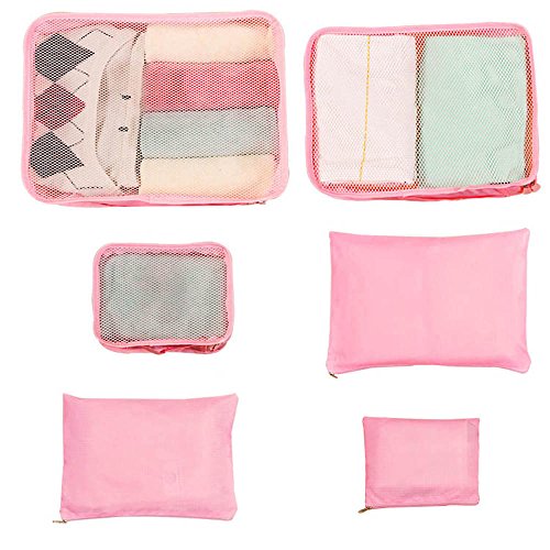 Dragon - مجموعة 6 قطع من وحدات تنظيم شنط السفر حقائب ضغط الامتعة بتصميم عصري بسحاب مزدوج مصنوعة البوليستر المقاوم للماء بينك زهري دراجون