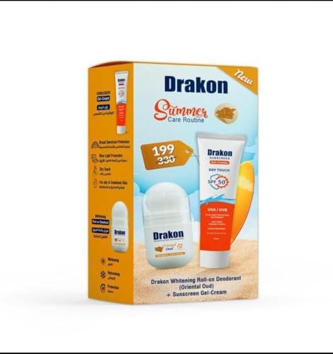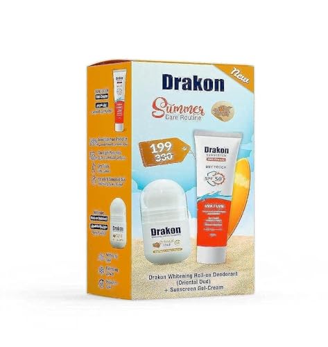 Drakon - مزيل عرق رول اون برائحة العود الشرقي، بالإضافة إلى كريم جل واقي شمسي (50 مل + 60 جم). يتميز بلمسة جافة وعامل حماية من الشمس 50+ (الطويلة والمتوسطة) مناسب لجميع أنواع البشرة من دراكون