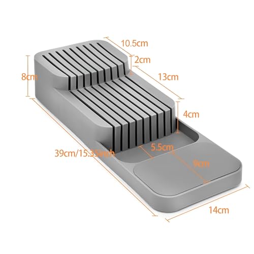 - متعدد الاستخدامات وعملي: يوفر مساحة تخزين السكاكين مساحة لما يصل إلى 18 قطعة من سكاكين اللحم مقاس 22 سم أو السكاكين العالمية أو سكاكين الزبدة أو ما يصل إلى 6 قطع من سكاكين الطهاة مقاس 43 سم وسكاكين الخبز وغير ذلك الكثير. تصميمه الأنيق والعصري لا يناسب الدرج فحسب، بل يعرض أيضًا مجموعة السكاكين الخاصة بك بشكل جميل على طاولة المطبخ. يمكنك استخدام درج السكاكين كديكور للمطبخ لجعل مطبخك مرتبًا ورائعًا.