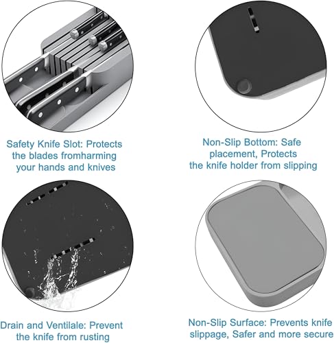 - تصميم غير قابل للانزلاق: تصميم غير قابل للانزلاق على الجزء الأمامي والسفلي من حامل السكاكين. يتضمن أقدام غير قابلة للإزالة موجودة في الجزء السفلي لضمان بقاء ملحق المطبخ آمن في الدرج أو على سطح العمل. يمكنك وضع درج حامل السكاكين بأمان في درج أو على سطح العمل، ولا تنزلق صينية السكاكين.