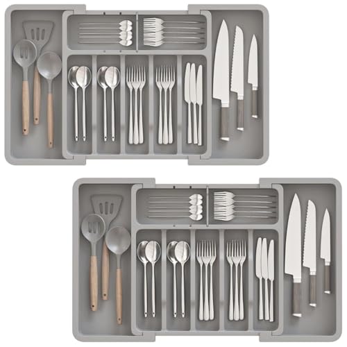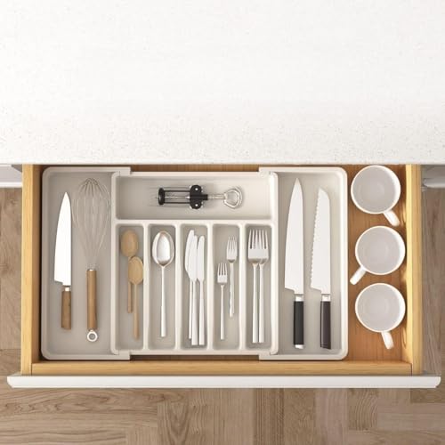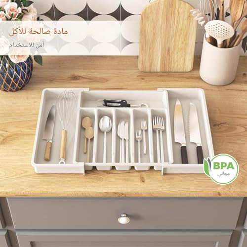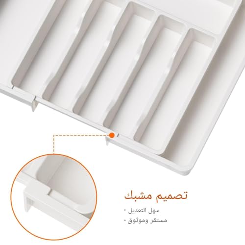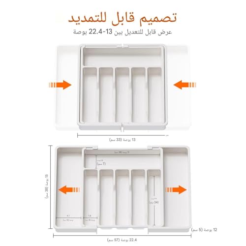 - يتميز منظم أدوات المائدة هذا بتصميم قابل للتوسيع بعرض قابل للتعديل من 33 سم إلى 22.4 انش، مما يضمن ملاءمة مثالية لأحجام الأدراج المختلفة مع توفير مساحة تخزين واسعة للأواني وأدوات المائدة وأدوات المطبخ. يمكن تعديل أبعادها بسهولة، مما يجعلها مناسبة لإعدادات المطبخ المختلفة.