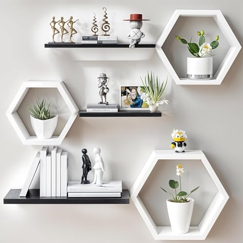 DDS Dream Decor Shoppee - رف معلق على الحائط من الخشب بتصميم سداسي الشكل من دريم ديكور شوبي، رفوف معلقة لعرض الصور والنباتات وغرفة المعيشة وغرفة النوم والحمام والمطبخ والمكتب (اسود وابيض)
