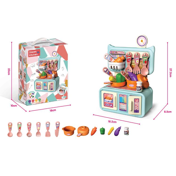 - أبعاد مثالية: يبلغ حجم المطبخ 18.2 سم عرضاً × 8.5 سم عمقاً × 27 سم ارتفاعاً، مما يجعله مناسباً للعب على الطاولة أو الأرض
