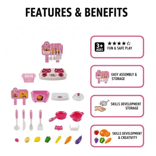 - محتويات المجموعة الكاملة: تتضمن أكثر من 17 قطعة مع موقد ذو عيون طبخ، طنجرة بغطاء، مقلاة، 4 أدوات طبخ، سلة تخزين، ساعة حائط، ورف تعليق للأدوات، وفواكه وخضروات متنوعة للعب الواقعي