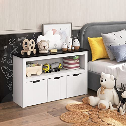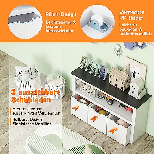 DREAMADE - رف للأطفال، دولاب ألعاب بعجلات و3 أدراج، وحدة تخزين ألعاب للأطفال، منظم الألعاب، رف ألعاب لغرفة الأطفال وغرفة المعيشة من دريماد، 1.02 م × 33 سم × 62 سم، سطح علوي بلون أسود