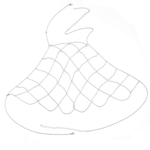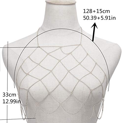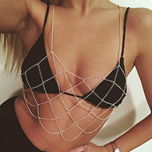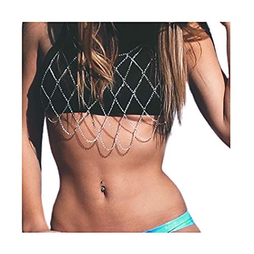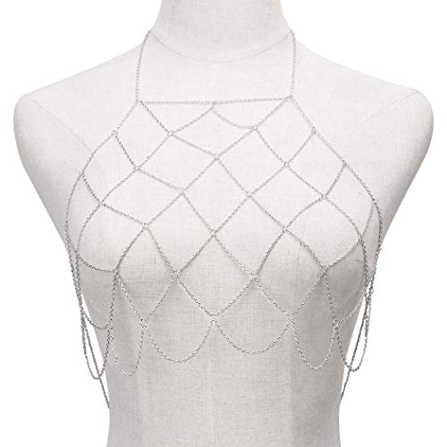 Drecode - دري كود سلاسل جسم بوهو بطبقات فضية، سلسلة صدر شبكية، حمالة صدر بيكيني للنادي الليلي والحفلات والشاطئ، اكسسوارات للجسم مجوهرات للنساء والفتيات