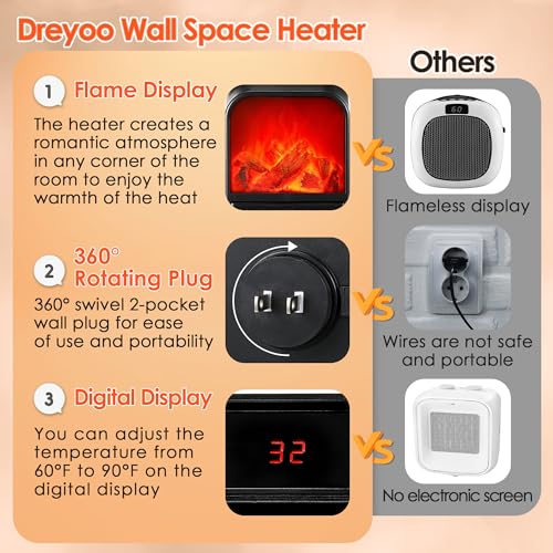 Dreyoo - دفاية حائط صغيرة كهربائية تتميز بترموستات قابل للتعديل وخاصية الحماية من الحرارة الزائدة وعداد الوقت وشاشة ال اي دي دقيقة مع قابس سريع وآمن للمكتب وغرفة النوم بقدرة 500W من دريو، قطعتان
