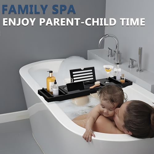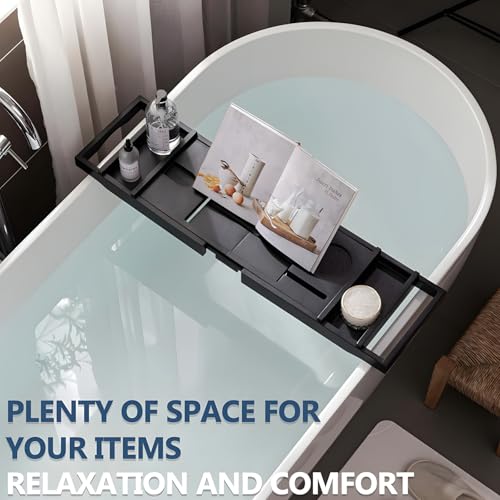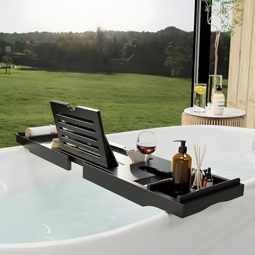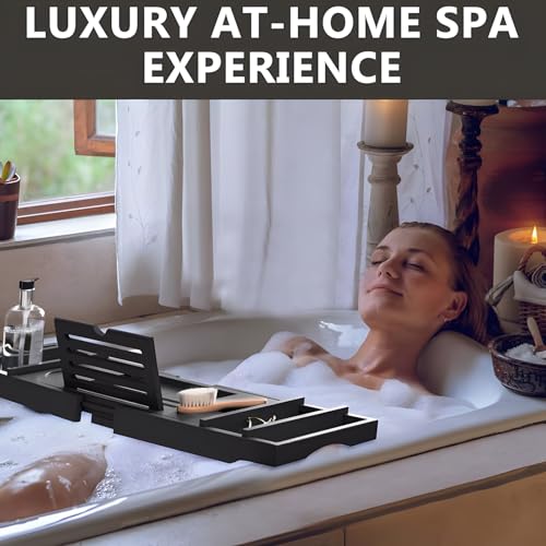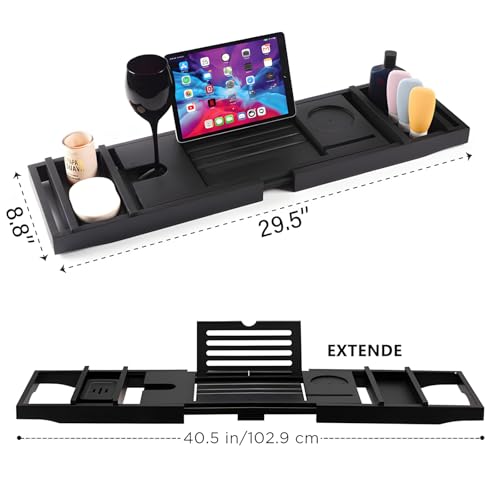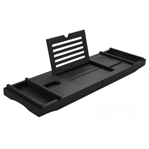 Drimzate - صينية حوض استحمام انيقة متعددة الوظائف من الخيزران قابلة للتوسيع من دريمزات، صندوقين، رف منظم للحمام لمستلزمات الغسيل والنبيذ والجوال (اسود)