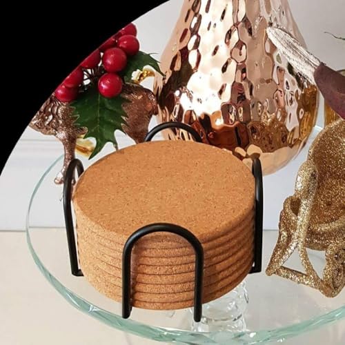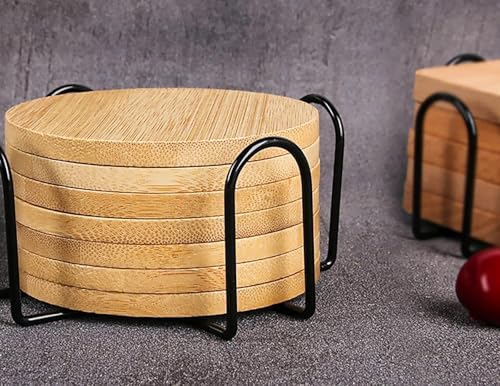 - محتويات المجموعة: طقم من 6 قطع كوسترات خشبية دائرية مع حامل معدني منظم لسهولة التخزين والوصول السريع