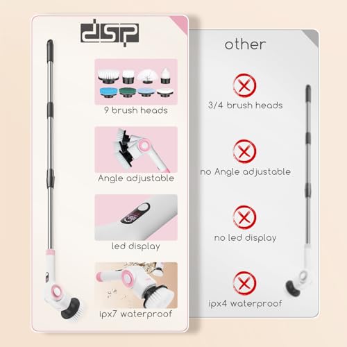 DSP - فرشاة تنظيف دوارة كهربائية مقاومة للماء بدرجة IPX7 مع عمود تلسكوبي قابل للتعديل وزوايا قابلة للتعديل، تعمل وفق 3 سرعات لتنظيف حوض الحمام والأرضيات والبلاط، شاشة ال اي دي من DSP