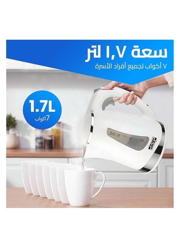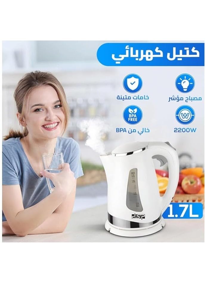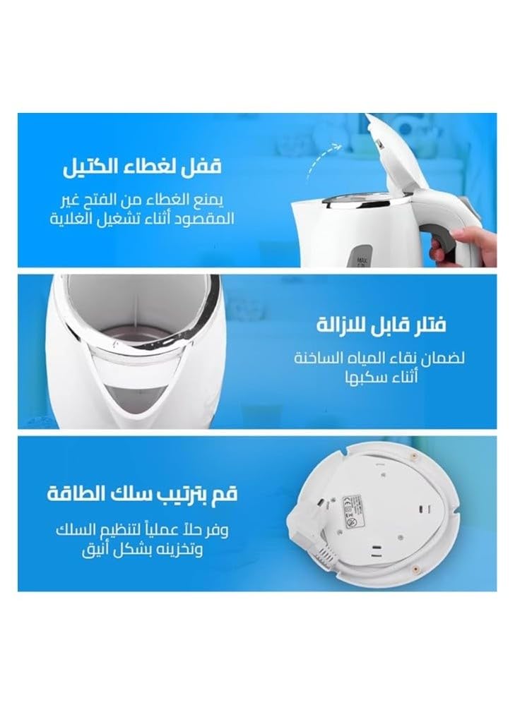 - غلاية كهربائية 2200 وات سعة 1 لتر مصنوعة من هيكل صلب بفلتر قابل للإزالة من دي اس بي، مزودة بعنصر تسخين صلب ومؤشر إضاءة وحماية من الغليان عند جفاف الماء، إيقاف تلقائي، وقاعدة دوارة - موديل KK1110.