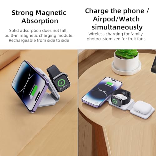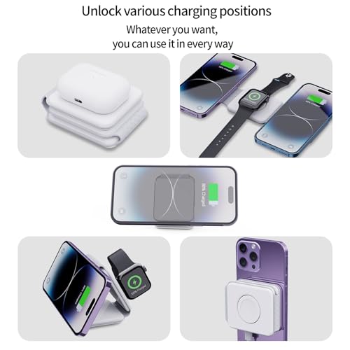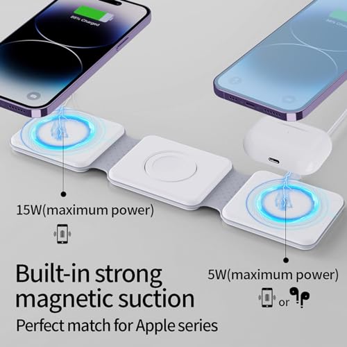 DTD - شاحن لاسلكي قابل للطي 3 في 1 حامل شحن مغناطيسي متوافق مع ايفون 15 14 13 12 برو ماكس بلس لساعة اي ووتش 9 الترا 2 8 7 6 اس 5 4 ايربودز من دي تي أبيض