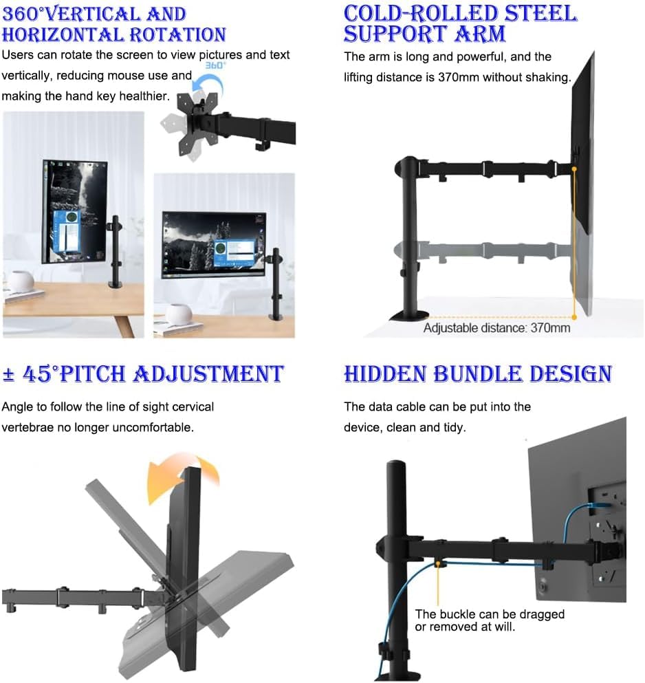 - 【مفصلية وقابلية تعديل الارتفاع】 يوفر الذراع القابل للتعديل إمالة من +90° إلى -90°، ودوران 180°، وتدوير 360°، وتعديل الارتفاع على طول العمود المركزي. يمكن وضع الشاشات في اتجاه عمودي أو أفقي.