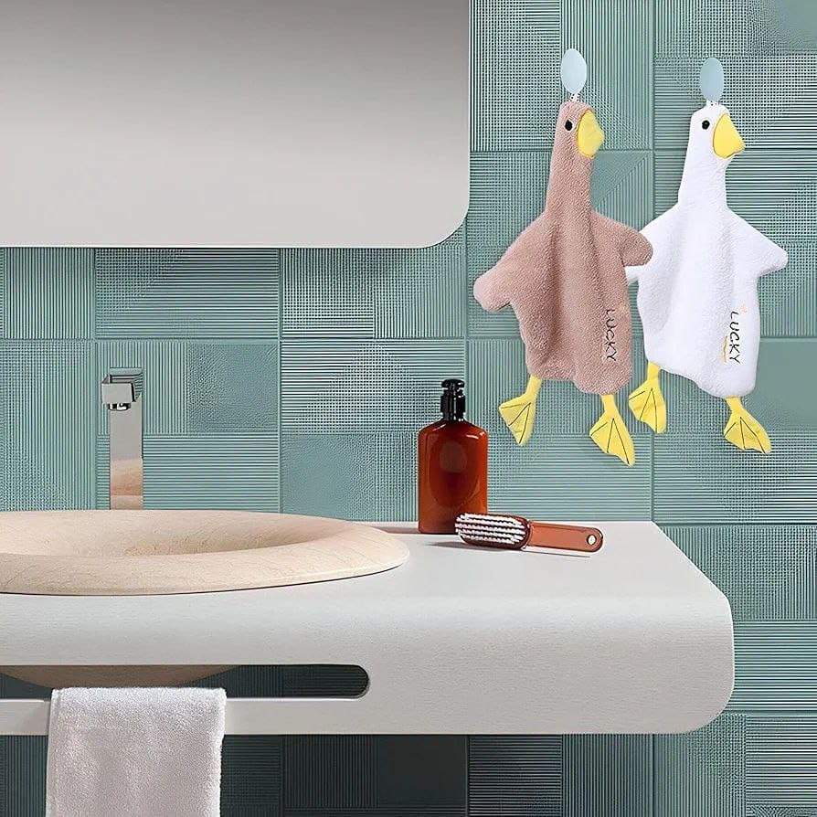 - تصميم مبتكر: منشفة يد على شكل بطة لطيفة بألوان أبيض ورمادي، تضيف لمسة جمالية ومرحة لحمامك أو مطبخك