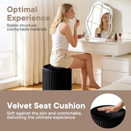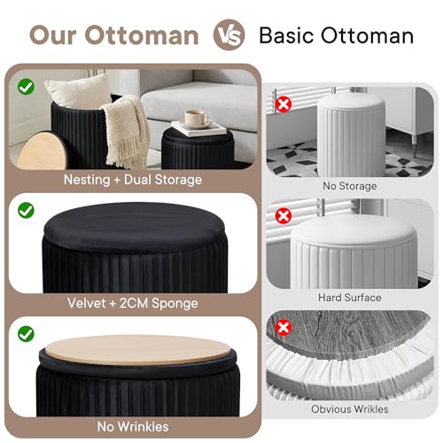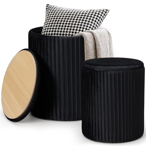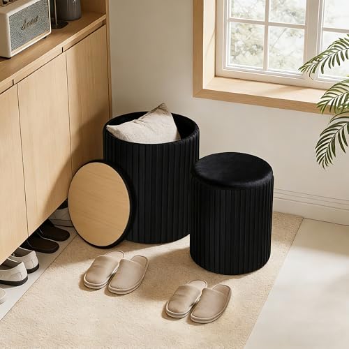 DUMOS - مسند قدم دائري من دوموس مع مجموعة تخزين من قطعتين، كرسي فانيتي مع مساحة تخزين، مسند قدم صغير لطيف وناعم لطاولة القهوة، كرسي قدم مخملي صغير لغرفة المعيشة وغرفة النوم والسكن، اسود