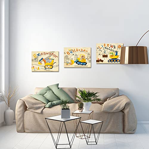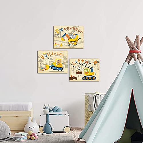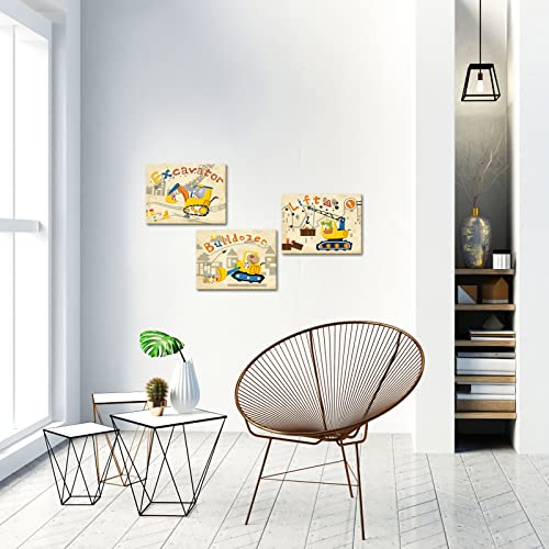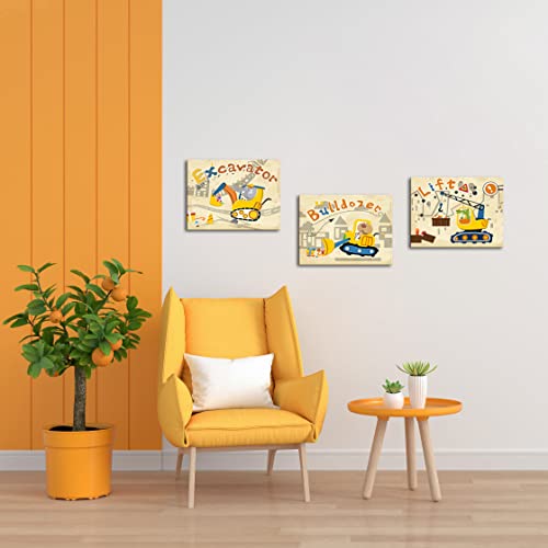 DuoBaorom - دووباوروم 3 قطع من شاحنات البناء لديكور حائط غرفة الاطفال صورة حفارة صفراء لجرافة الحضانة او ديكور المنزل ممتدة ومؤطرة جاهزة للتعليق 12 × 16 انش متعدد