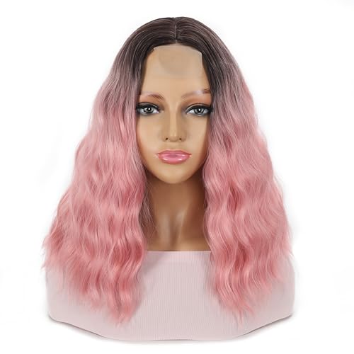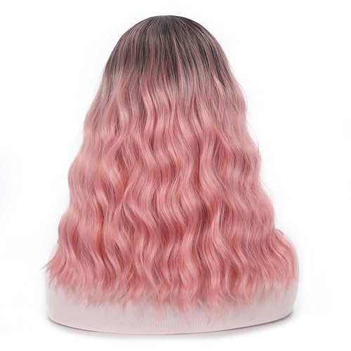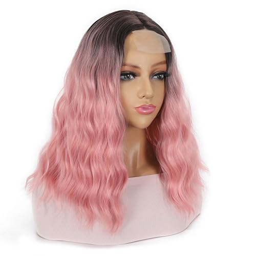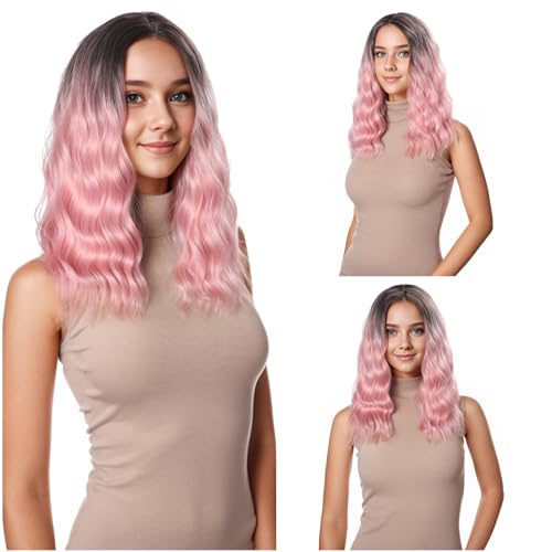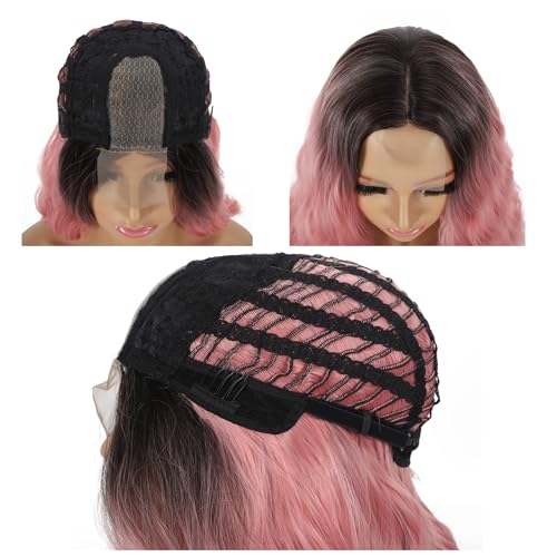 DUOLI - شعر مستعار بوب مموج قصير بلون بينك متدرج للنساء، شعر مستعار صناعي بفرق في المنتصف، شعر مستعار قصير مجعد بمظهر طبيعي بطول الكتف (14 بوصة)