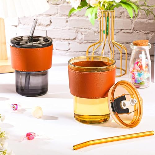 Generic - كوباية زجاجية متينة بتصميم عملي مزودة بغطاء محكم لمنع الانسكاب وشفاطة زجاج مع جراب جلد أنيق للاستخدام اليومي متعدد الالوان