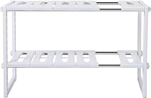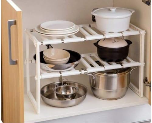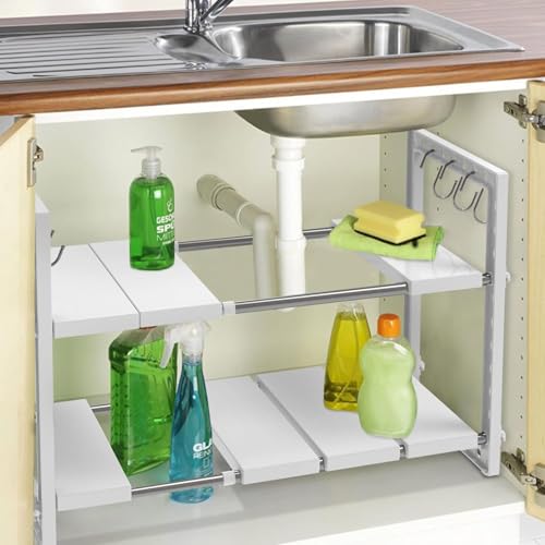 Generic - منظم تخزين متين أسفل الحوض - رف قابل للتمدد بعرض قابل للتعديل، مع رفوف بلاستيكية قابلة للتخصيص، مثالي لتنظيم أدوات تنظيف المطبخ، ومستلزمات الحمام، ومستلزمات دولاب المؤن