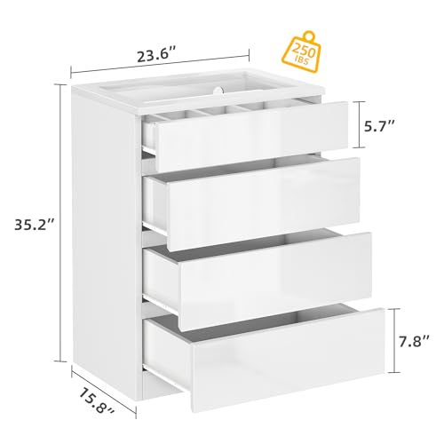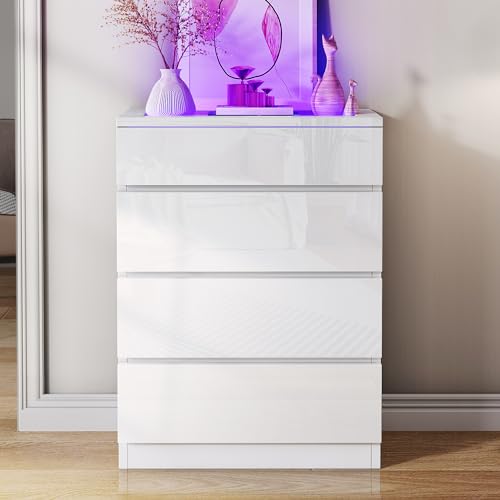 DWVO - خزانة ملابس بـ4 أدراج بإضاءة ليد من دي دبليو في اوه، خزانة بيضاء عصرية بـ4 أدراج مع أدراج عميقة وسطح علوي من الزجاج المقوى عالي اللمعان، خزانة منظمة للتخزين مقسمة لغرفة المعيشة