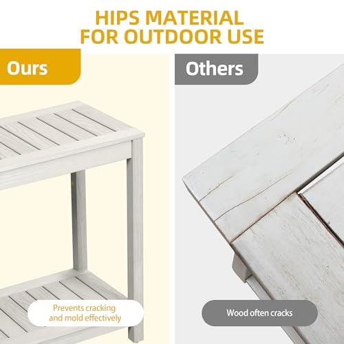 - مادة مقاومة للطقس: مصنوعة من مادة البولي إيثيلين عالية الكثافة (البلاستيك الصلب) مع لمسة نهائية من الخشب الحبيبي، وتتحمل العناصر بما في ذلك الشمس أو الثلج الغزير أو المطر أو الرياح الساحلية.