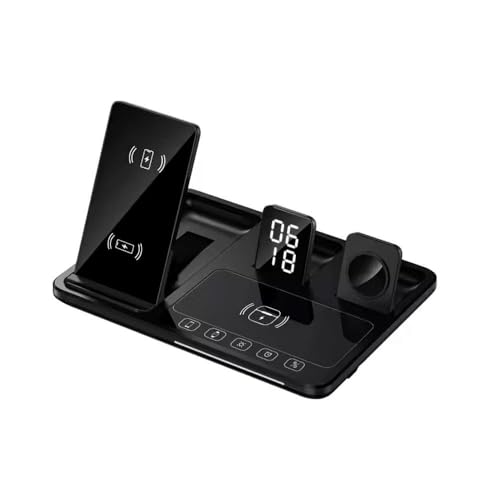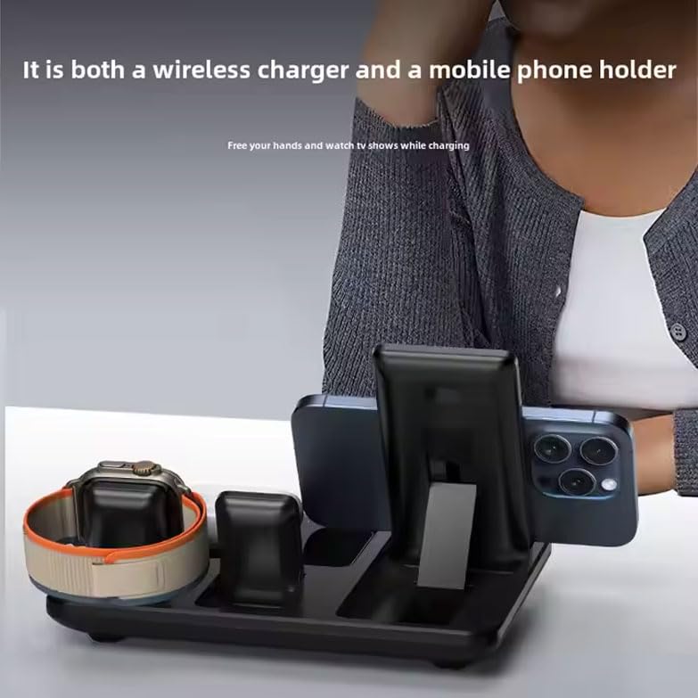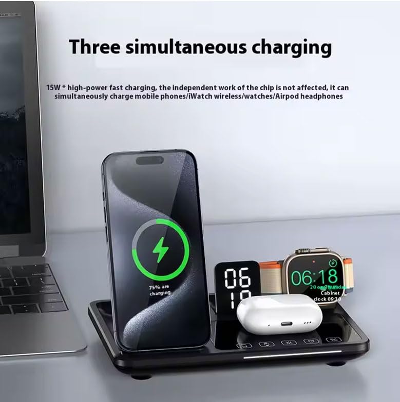 - 🪀 شاحن لاسلكي 4 في 1: قاعدة الشحن اللاسلكية مع شاشة عرض الساعة، وتدعم شحن 3 أجهزة - الموبايلات والساعات وسماعات الأذن في نفس الوقت.