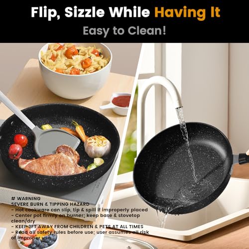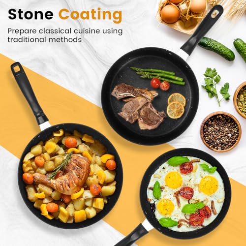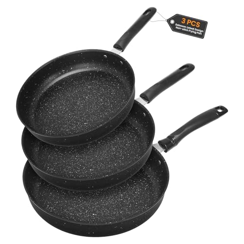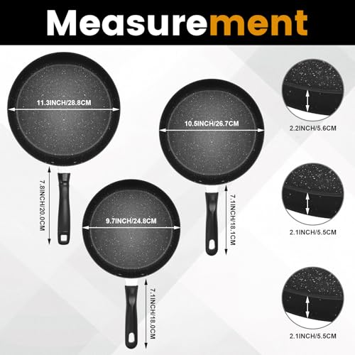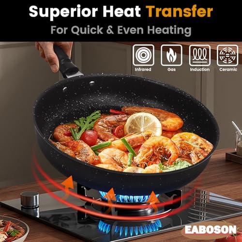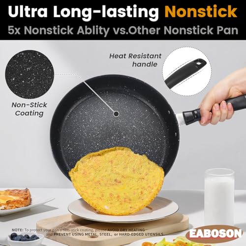 EABOSON - مجموعة مقلاة غير لاصقة من ايبوسون مكونة من 3 قطع، اواني طهي مطلية بالحجر، مقلاة بيض مقاس 9 و10 و11 انش بمقبض مقاوم للحرارة وخالية من حمض بيرفلورو الاوكتانويك ومتوافقة مع الحث