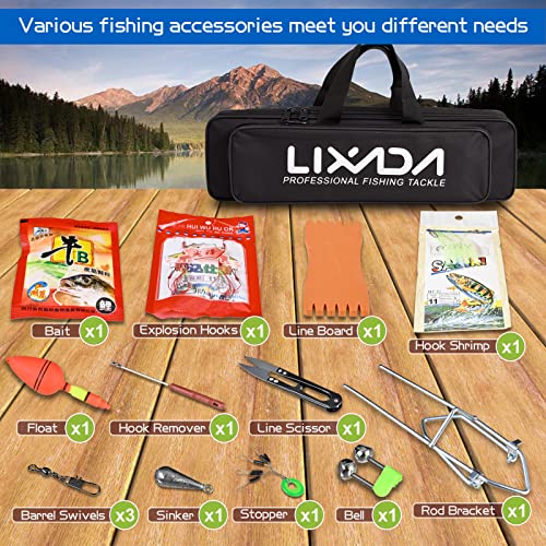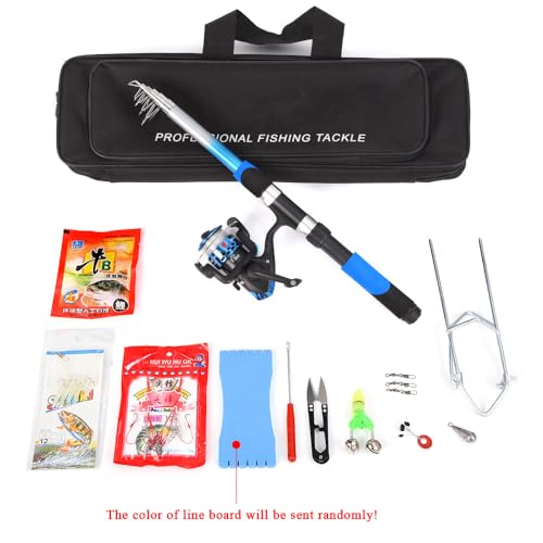 - 🐟 اكسسوارات الصيد: تأتي هذه المجموعة مع طُعم صيد وخطافات وبعض الاكسسوارات الضرورية والأجراس والخطافات والثقالات والعوامات. المجموعة الكاملة رائعة للمبتدئين والمحترفين. خفيفة الوزن وقابلة للحمل، ومريحة جدًا للحمل.