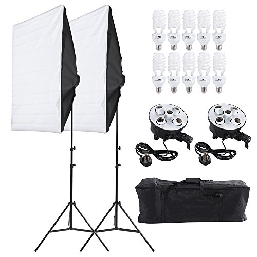 Eacam - مجموعة خيمة إضاءة ستوديو التصوير الفوتوغرافي (2 × سوفت بوكس + 2 × مقبس إضاءة 5 في 1 + 10 × لمبة 45 وات + 2 × حامل ثلاثي القوائم + 1 × شنطة حمل) قابس UK 220 فولت من ايكام