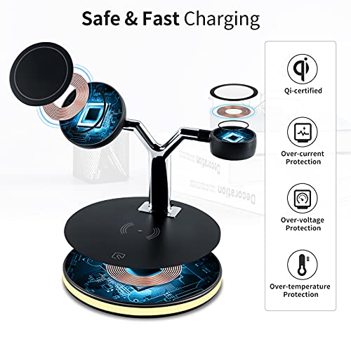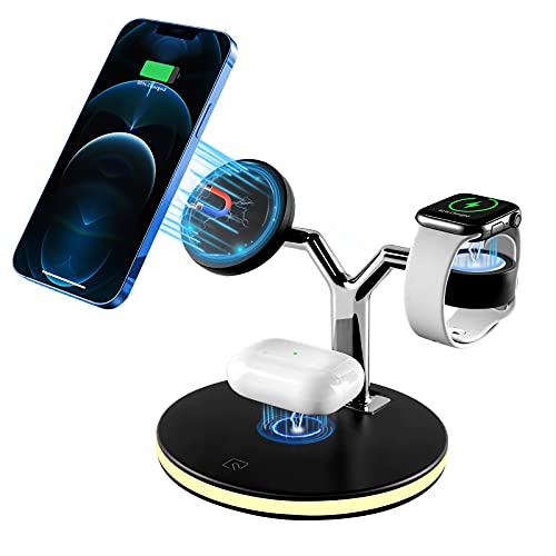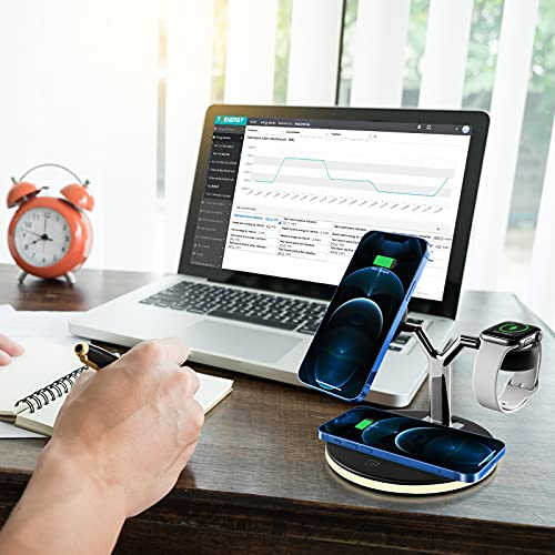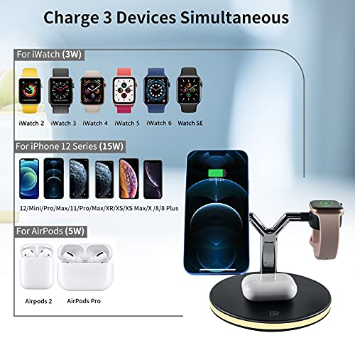 EALEK - قاعدة شحن لاسلكية مغناطيسية 3 في 1 متوافقة مع سلسلة ايفون 12/ اي ووتش/ ايربودز ماج سيف بتصميم إضاءة ليلية من اياليك، قاعدة شحن لاسلكية سريعة 15 وات (أسود)