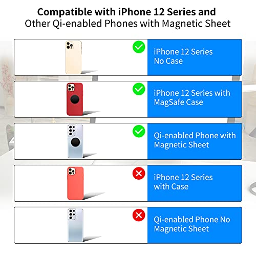 - 【توافق واسع】الشاحن اللاسلكي المغناطيسي متوافق مع سلسلة ايفون 12، ايربودز 2/برو، واي ووتش اس اي/6/5/4/3/2. ويدعم الشاحن اللاسلكي المغناطيسي الخاص بنا جميع الموبايلات التي تدعم تقنية كيو اي (باستثناء سلسلة ايفون 12، تحتاج موبايلات كيو اي الأخرى إلى استخدامها مع ورقة مغناطيسية، متضمنة). ملاحظة: عند شحن الموبايل وسماعة الأذن والساعة معًا، يجب استخدام محول 18 وات، غير متضمن.