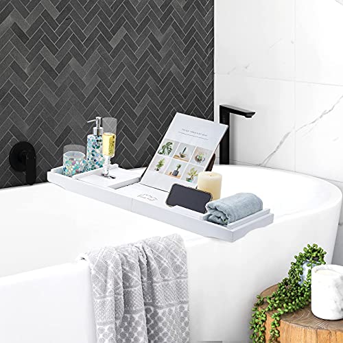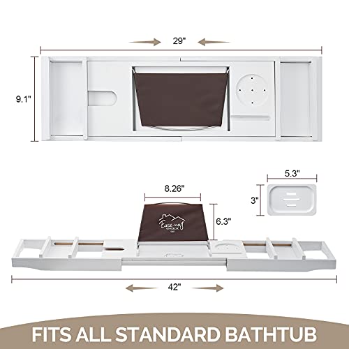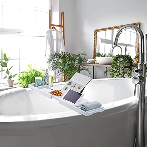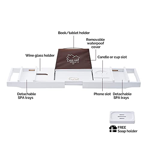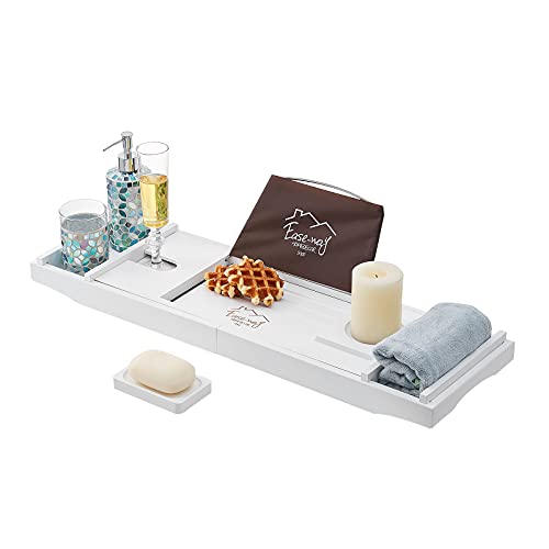 EASE-WAY - صينية حوض استحمام من الخيزران، صينية حمام خشبية لحوض الاستحمام مع حامل كتب وطبق صابون مجاني، تحمل الجوال، اللابتوب، منظم حوض الاستحمام القابل للتمديد للمنتجعات الصحية الفاخرة (ابيض)