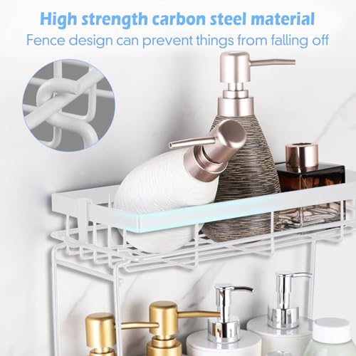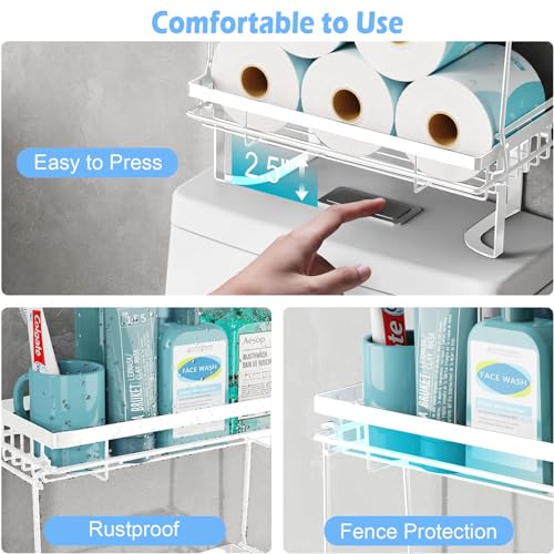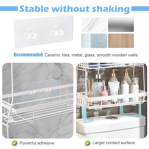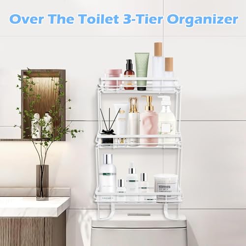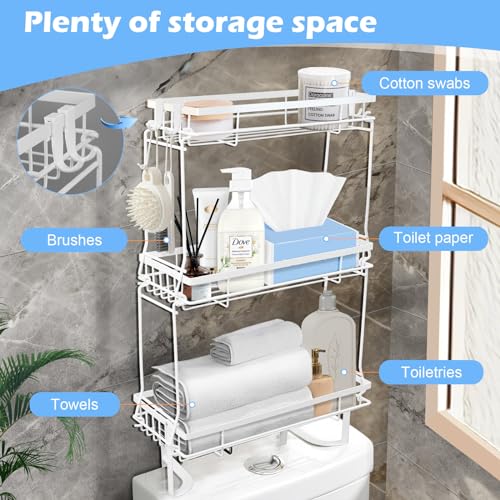 Easyhomie - رف تخزين فوق المرحاض من ثلاث طبقات، رف منظم حمام متعدد الوظائف مع 6 خطافات + ملحقات، بدون ثقب وسهل التركيب وموفر للمساحة (ابيض)
