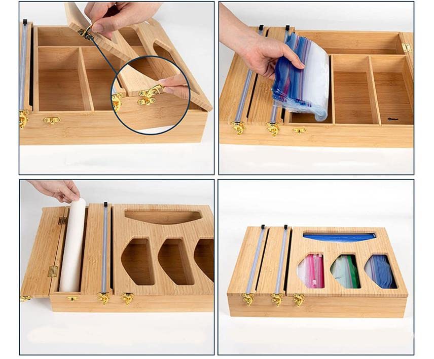 EAZE STORE - موزع أكياس بلاستيكية بسحاب من ايزي ستور، منظم أدراج المطبخ مع قطاعة منزلقة مدمجة للاستخدام في الأدراج أو يثبت على الحائط، موزع 6 في 1 من البامبو