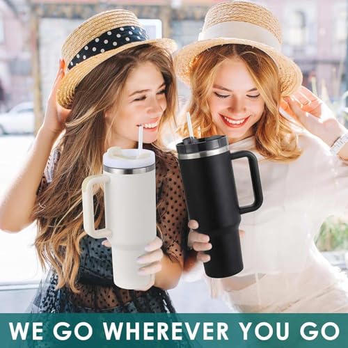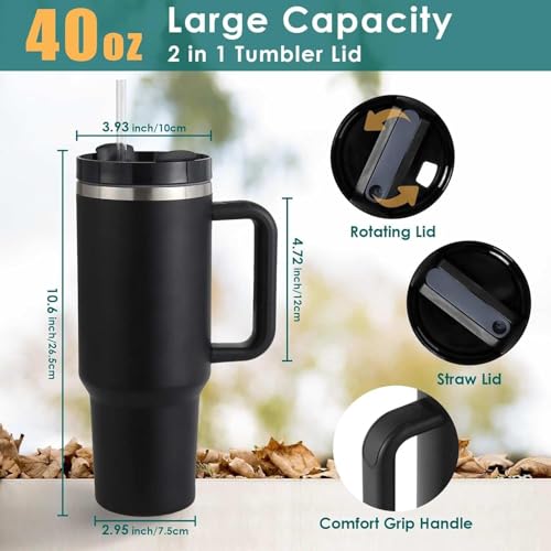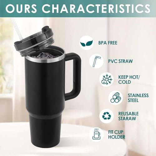 EBS SOUQ - كوب بسعة 40 اونصة مع مقبض من اي بي اس سوق، 2 ماصة وغطاء معزول بجدار مزدوج مفرغ من الهواء من الستانلس ستيل، كوب ماء للسفر قابل لاعادة الاستخدام (فحمي_اسود)